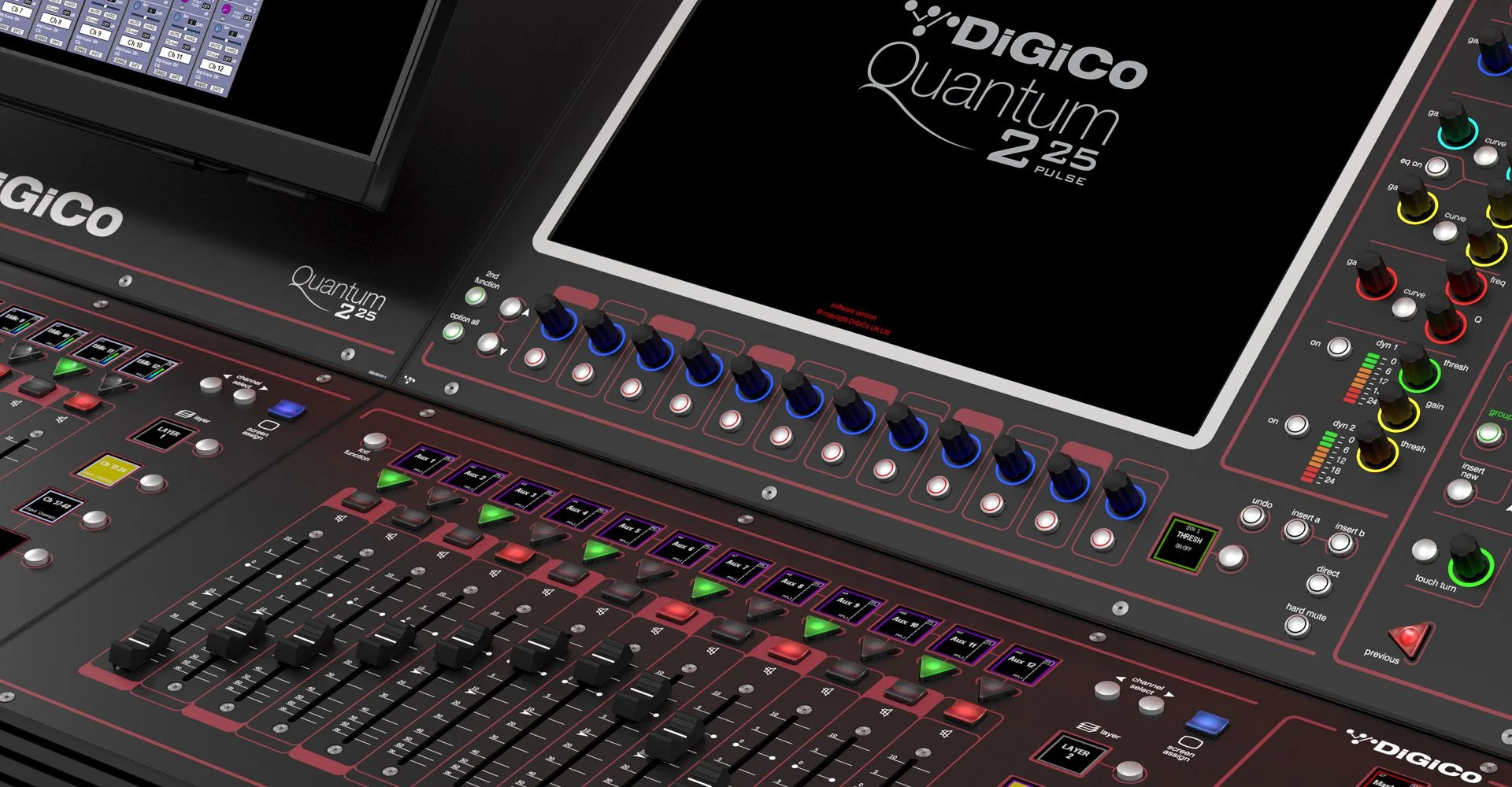 The DiGiCo Quantum 225DS Pulse is a 96 channel mixing console with 25 physical faders and 2 x 17” LCD high-resolution touchscreens. Like its larger counterpart, the Quantum 338, the Quantum 225DS offers all of the Quantum features plus new design features and enhancements in a smaller format console.